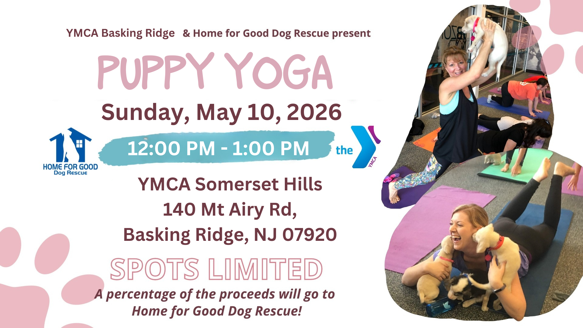 Puppy Yoga Fundraiser Event on Sunday, May 10, 2026 brings together beginner-friendly yoga and adoptable puppies at the Somerset Hills YMCA to support Home for Good Dog Rescue. It’s a relaxed, feel-good experience designed for all levels while directly helping dogs in need.