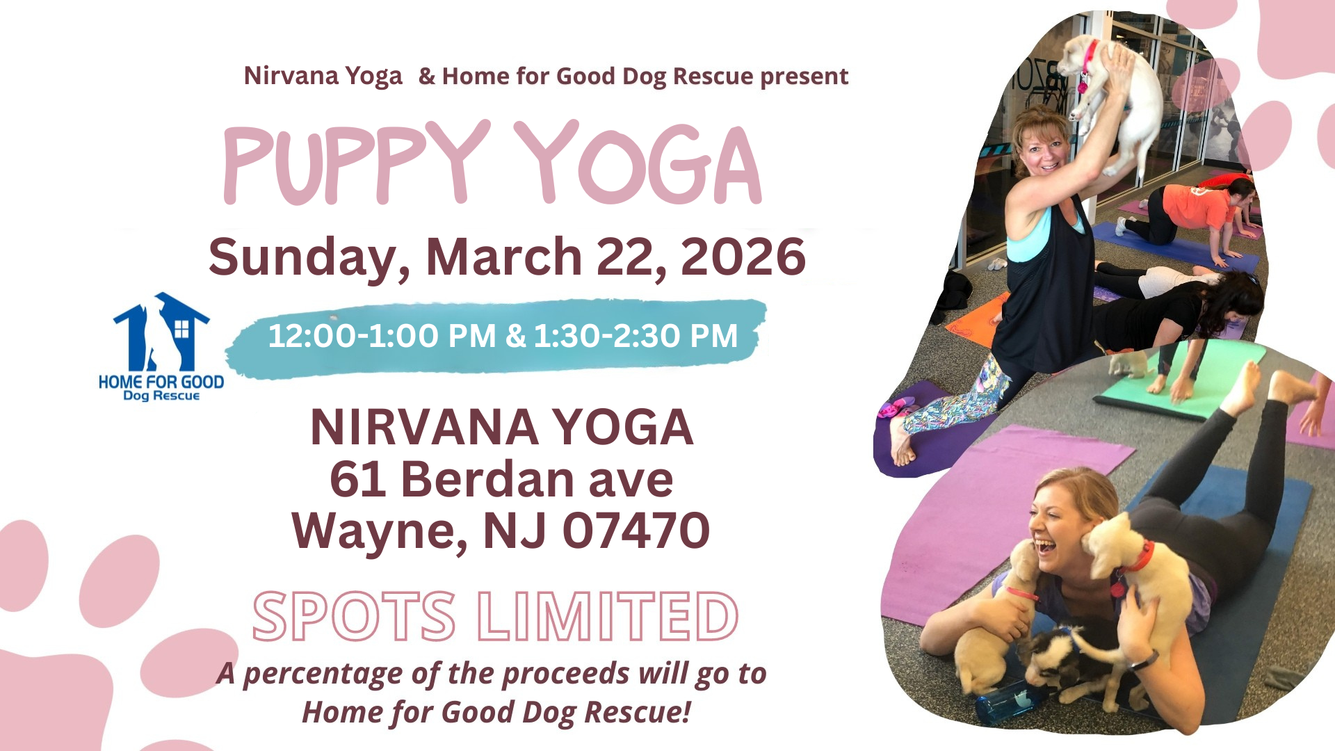 Join us for a Puppy Yoga Fundraiser – Sunday, March 22, 2026 at Nirvana Wellness Center in Wayne, NJ – for the most adorable yoga experience of the year. This one-hour, beginner-friendly yoga session will fill your afternoon with movement, mindfulness, and adoptable puppies. A portion of the proceeds benefit Home for Good Dog Rescue and our mission to save dogs from high-risk shelters.